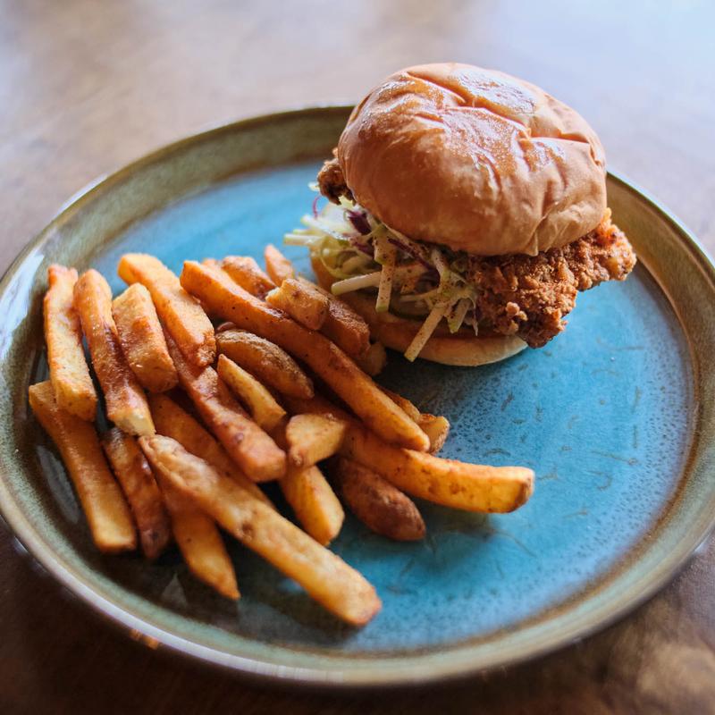 Buttermilk brined chicken, Zamm'z dry spice, apple slaw, pickle, comeback sauce, brioche bun