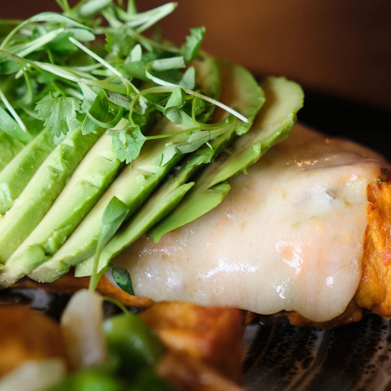 3 eggs, onion, bell pepper, oregano, avocado, white cheddar