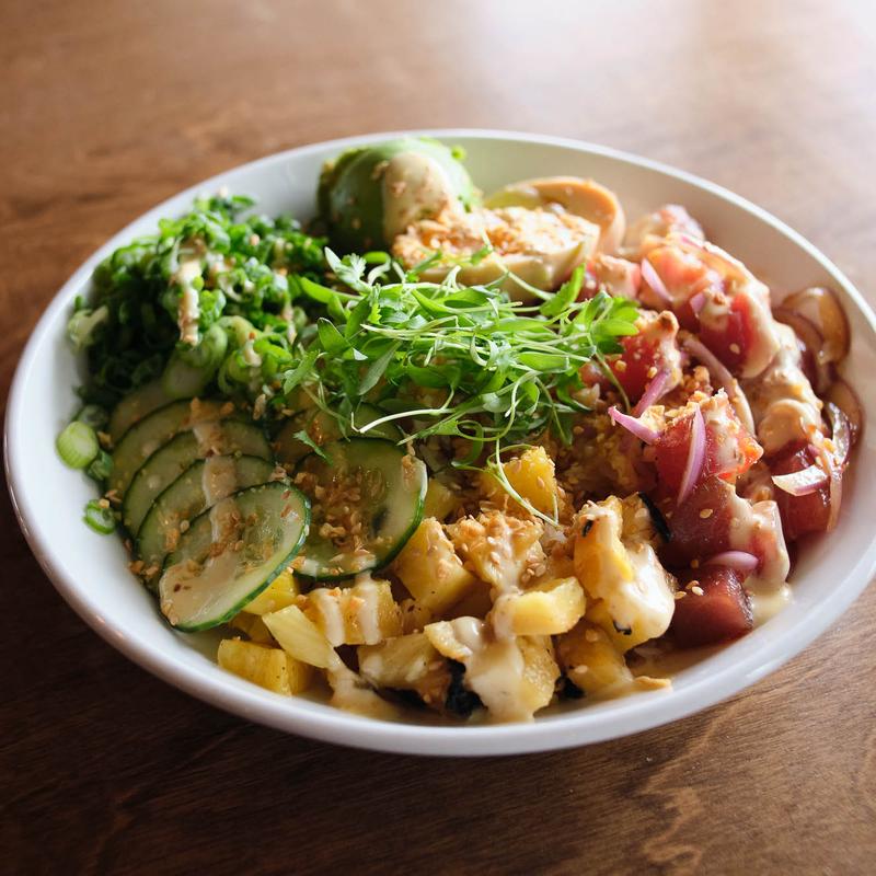 Red onion, avocado, pineapple, scallion, crunchy garlic, chili aioli, sesame, cilantro, ramen egg, choice of rice or spring mix