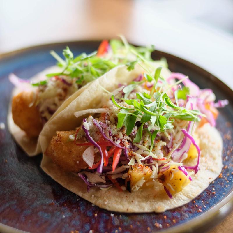 Beer battered cod, corn tortilla, pineapple slaw, cilantro crema