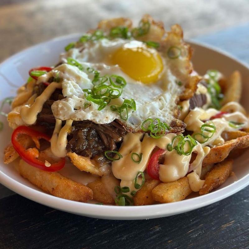 Cardiff Crack Tri-Tip, Karl Strauss Red Trolley beer cheese, chili aioli, onions, Fresno chili, sunny egg